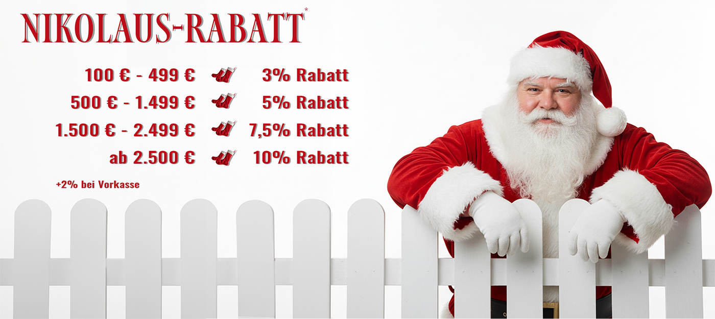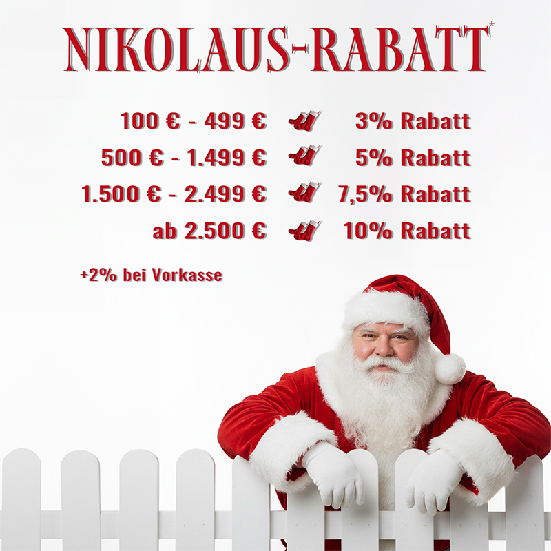 Hol dir exklusiv bis einschließlich Montag, den 08.12.2025 deinen individuellen Nachlass! Bei unserer NIKOLAUS-RABATT-STAFFEL* ist für jeden etwas dabei - du sparst ab 100€ je nach Einkaufswert bis zu 10% zusätzlich! Je höher der Warenwert, desto größer der Rabatt. Und bei Zahlung per Vorauskasse bekommst du zusätzlich weitere 2% Sonderrabatt!